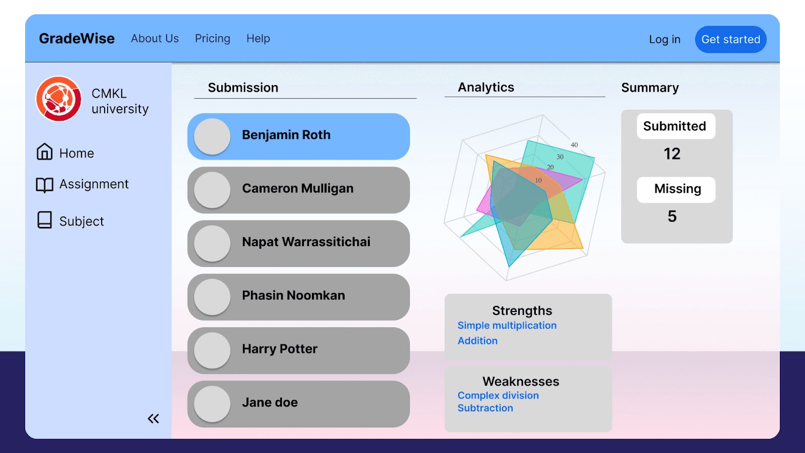 For GradeWise, the user experience was front and center from day one. Drawing inspiration from platforms like Canvas and Google Classroom, the team created a clean, intuitive dashboard that focuses on what matters most: student performance. Their prototype, built in Figma, went through several rounds of feedback and revision, ensuring it is easy to navigate, even for teachers who aren’t tech-savvy.